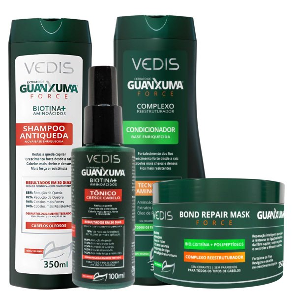 1) Lavar os cabelos diariamente com o Shampoo Guanxuma Vedis, deixando agir por 2 minutos, podendo enxaguar e repetir a aplicação.